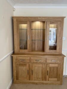 To complete the look, we added a matching Quercus oak display cabinet with soft-close drawers, glass-fronted doors, and LED lighting—perfect for showcasing glassware or treasured items. Each piece is handcrafted right here in our Warminster workshop, where traditional joinery meets modern functionality.