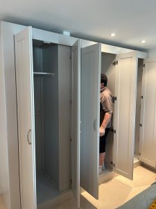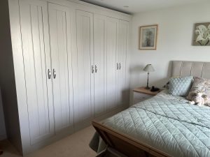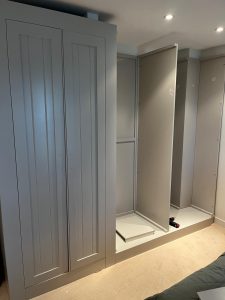 An extruded wall meant a standard wardrobe simply wouldn’t work. Instead of compromising, we designed a fully made-to-measure painted wardrobe that wraps neatly around the projection, creating a clean, built-in appearance as if it had always been part of the room.