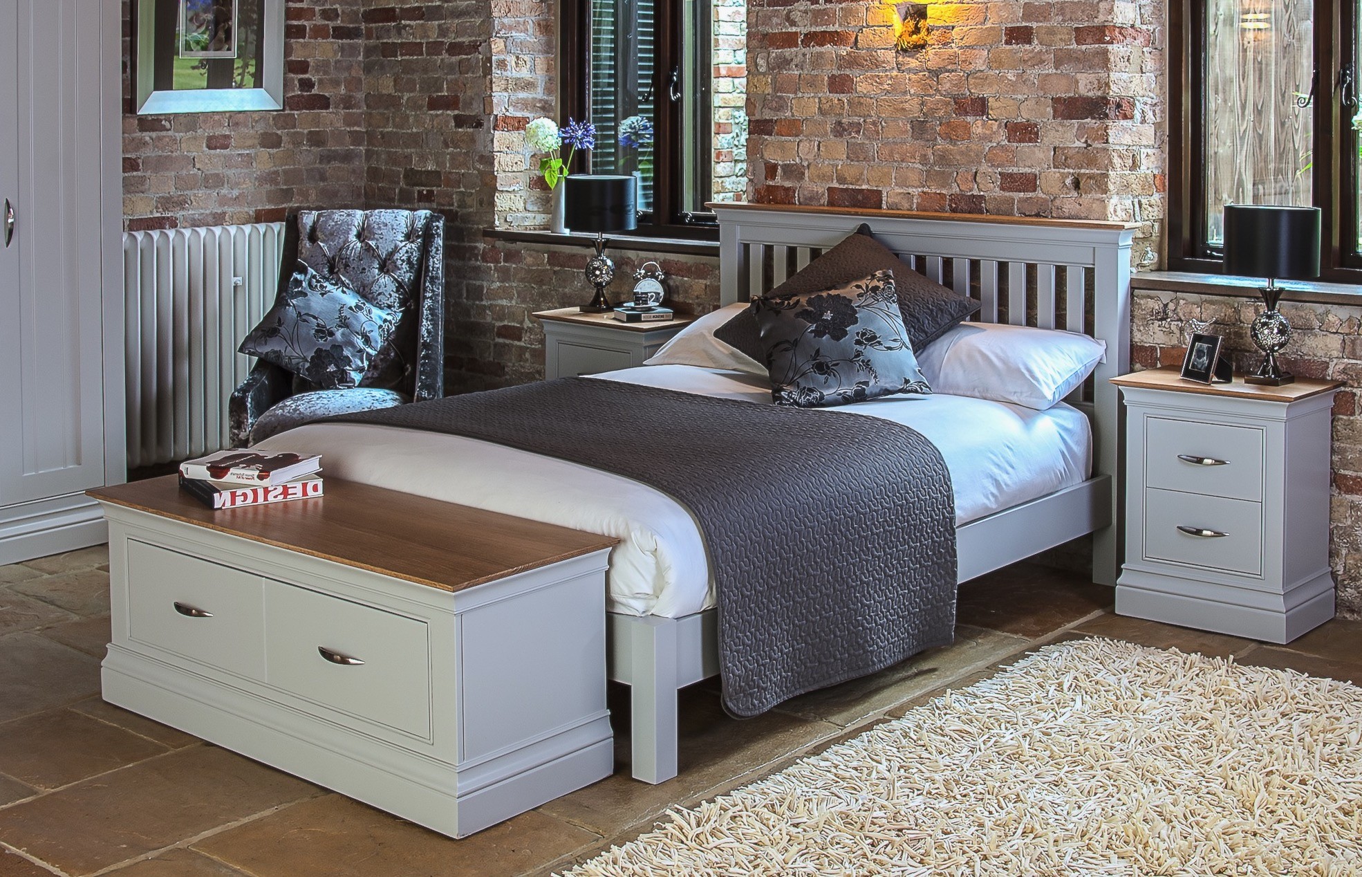 Vienna grey painted bedroom furniture deigned with elegant mouldings and fine beading around frame, solid oak tops and brushed steel handles